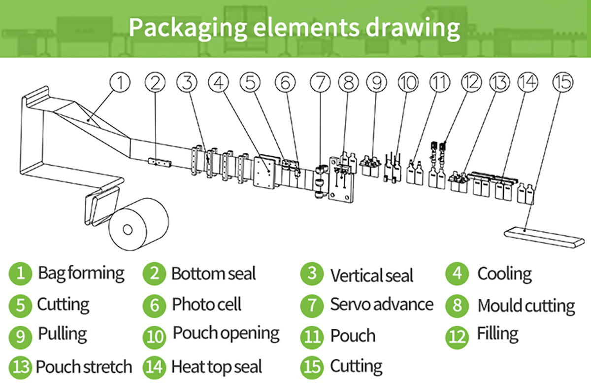 The machine adopts a full servo motion control system, and automatic roll film bag forming, the machine can customize flat bags, stand-up bags, special-shaped bags, and material filling and sealing functions according to customer needs, and is equipped with storage and unloading devices, which can realize functional drinks, enzymes, etc. Fully automatic packaging of puree, health care products, probiotic milk products, pastes, sauces, and other materials. The machine has high stability, and the finished product has firm sealing and a beautiful appearance. Automatic production project suitable for special-shaped bags