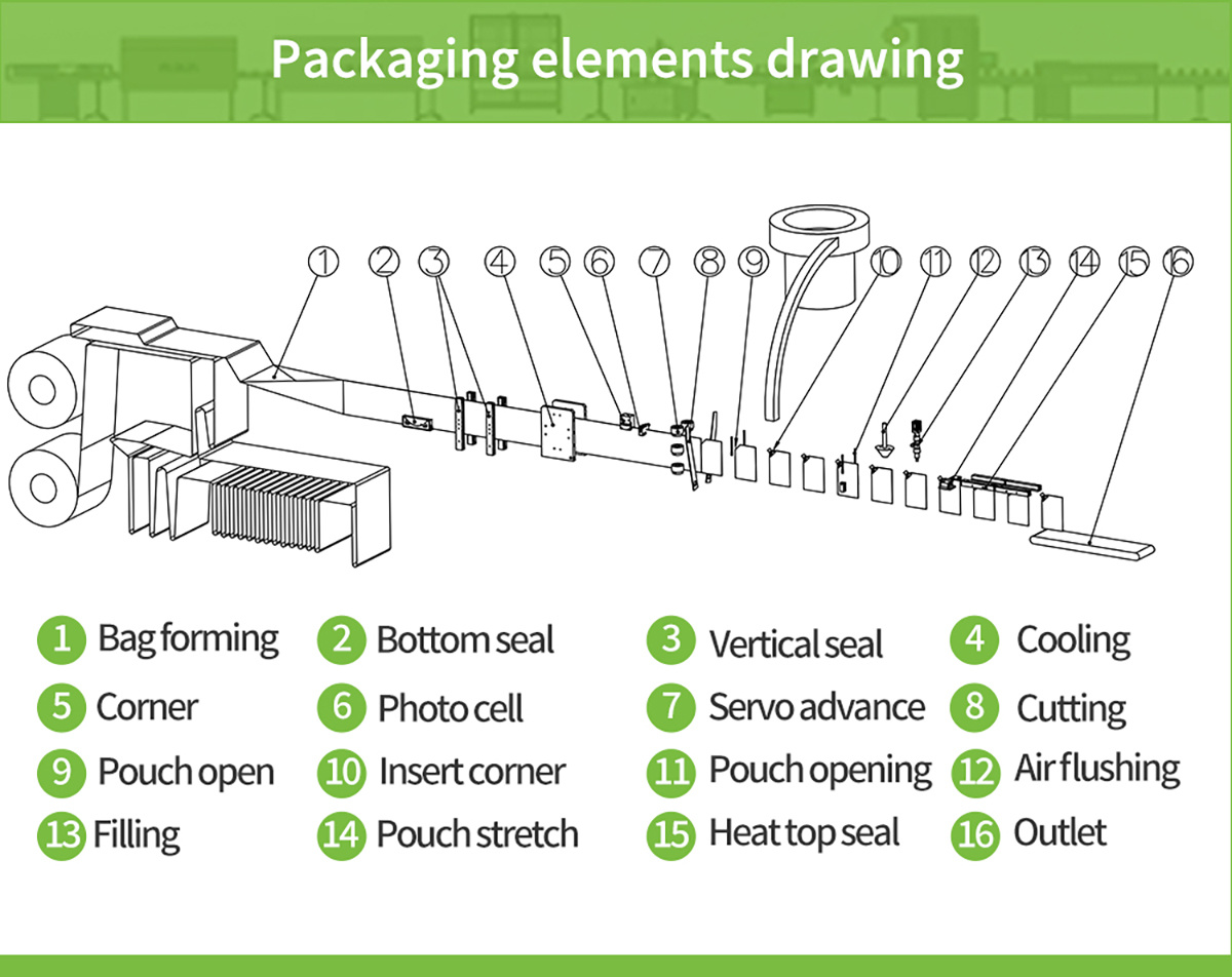 Horizontal Corner Spout Stand up Packing Machine can automatic bagging, filling, nozzle addition, nozzle welding, sealing. It's packing beverages, sauces