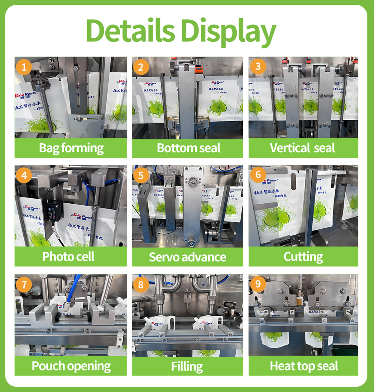 This machine can realize the packaging needs of oblique suction nozzle bags, and can also add hanging holes, special shapes, zippers, suction nozzles and other functions, realizing automatic bagging, automatic filling, automatic nozzle addition, automatic nozzle welding, and automatic sealing. It is used in the packaging of salt, lubricating oil, beverages, juice, yogurt, sauces, edible oil, and cleaning series.